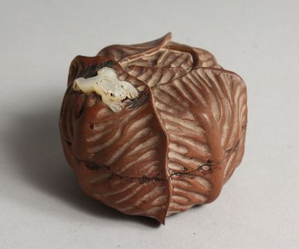 A JAPANESE WOOD CABBAGE BOX AND COVER with a mother of pearl frog