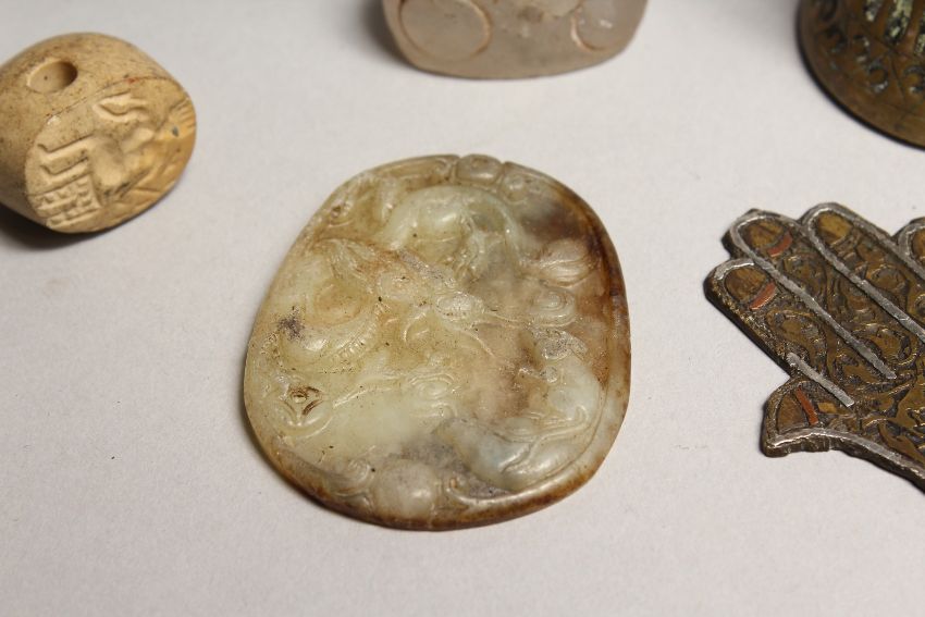 A BELL SEAL, TWO ISLAMIC HANDS, TWO SEALS AND THREE VARIOUS PIECES.
