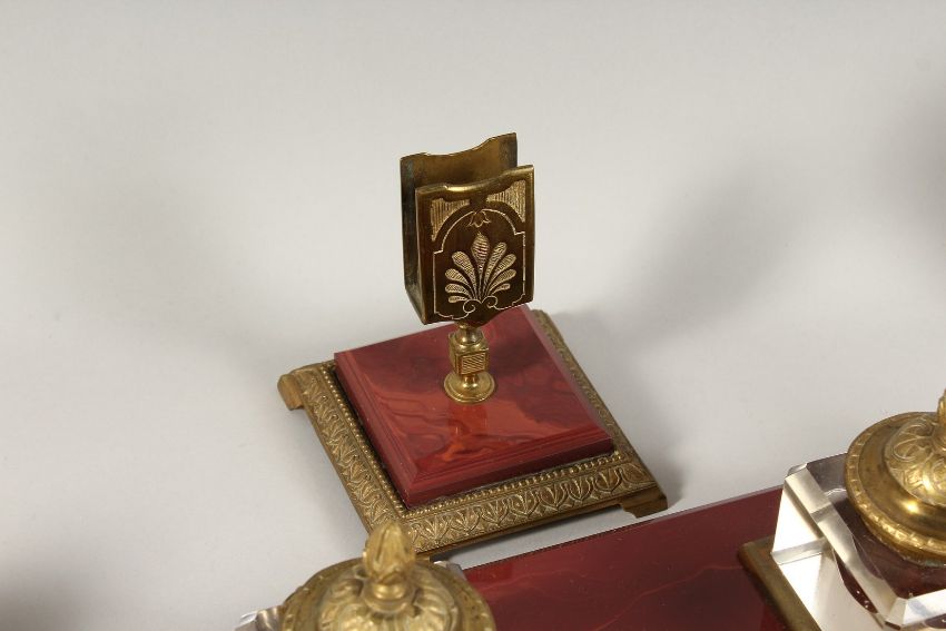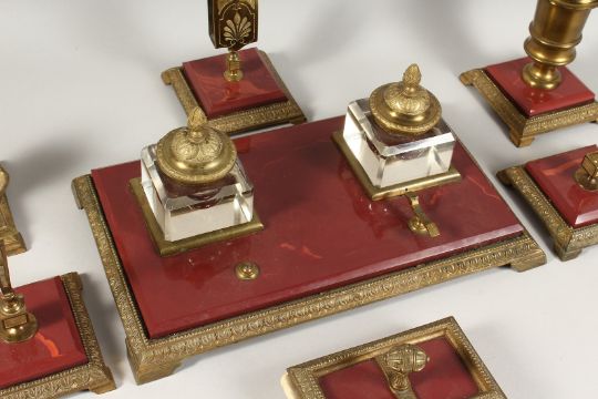 A SUPERB RUSSIAN HARDSTONE AND GILT METAL DESK SET, comprising inkstand with two glass bottles, 13 ins long, blotter, match stand, pair of candlesticks, vase and holder.