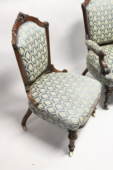A GOOD VICTORIAN MAHOGANY FRAMED ARMCHAIR AND MATCHING NURSING CHAIR with matching covers on white porcelain casters.