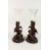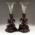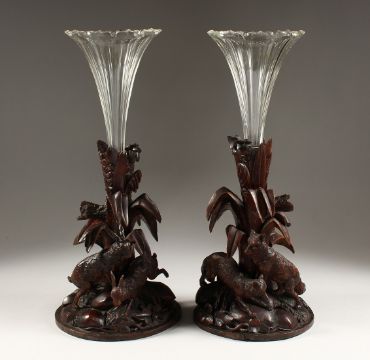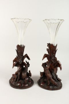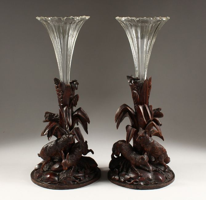 A GOOD PAIR OF BLACK FOREST CARVED WOOD VASE STANDS, one carved as a pair of rabbits, the other a pair of foxes, each holding a glass trumpet shaped vase.