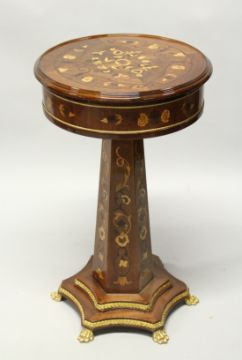 A FRENCH STYLE MARQUETRY INLAID DRUM TABLE on an hexagonal column with shaped base and ormolu feet.