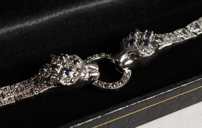 A SILVER, SAPPHIRE AND MARCASITE PANTHER BRACELET