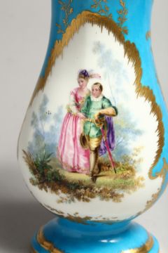 A GOOD SEVRES PORCELAIN EWER, blue ground edged in gilt and painted with three panels of figures and flowers