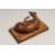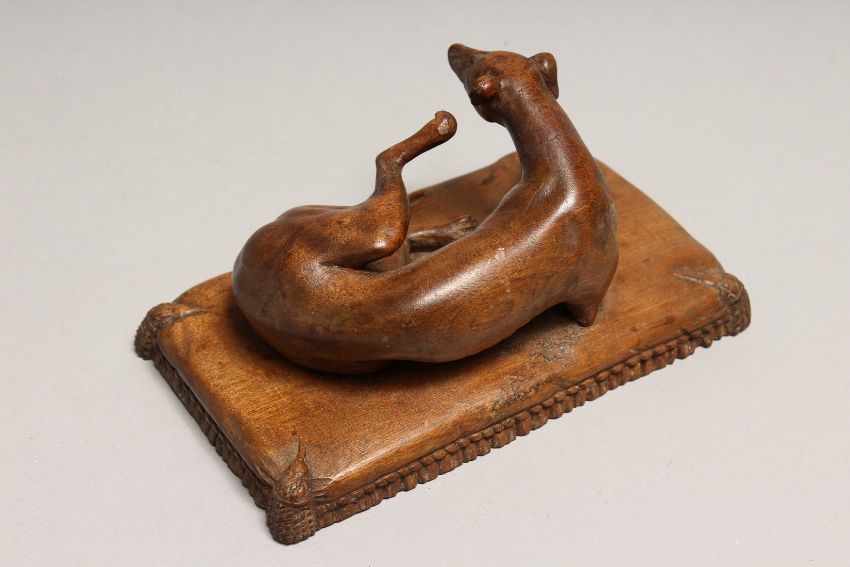AFTER GOTT. A CARVED WOOD FIGURE OF A DOG on a cushion