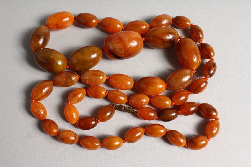 AN AMBER TYPE BEAD NECKLACE with forty six graduated beads