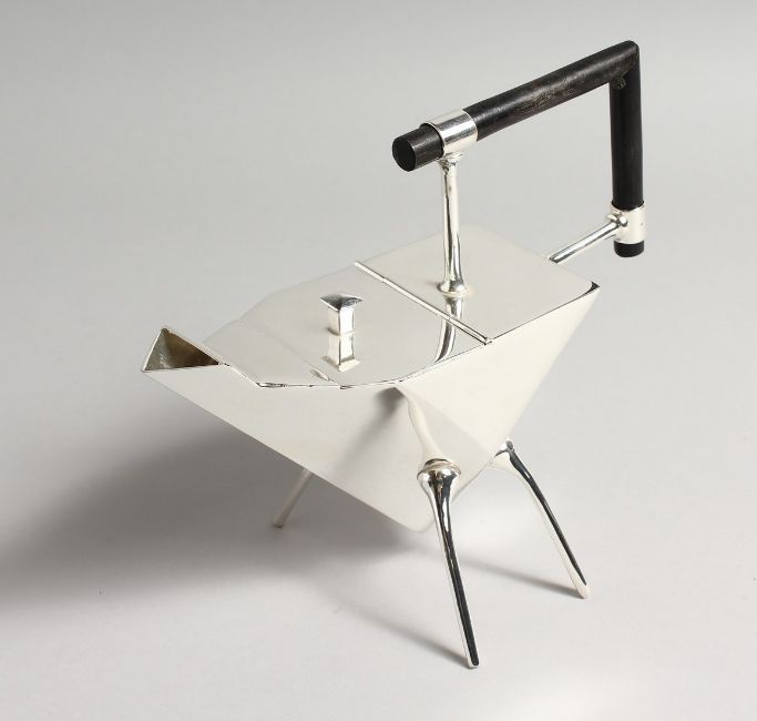 A PLATED TRANGULAR SHAPED CHRISTOPHER DRESSER STYLE PLATED TEAPOT.