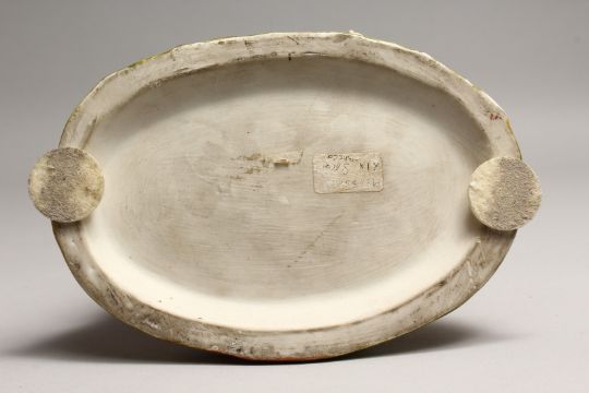 A GOOD 19TH CENTURY CONTINENTAL POTTERY GROUP depicting the grape harvest, one sitting on a barrel, on an oval base.