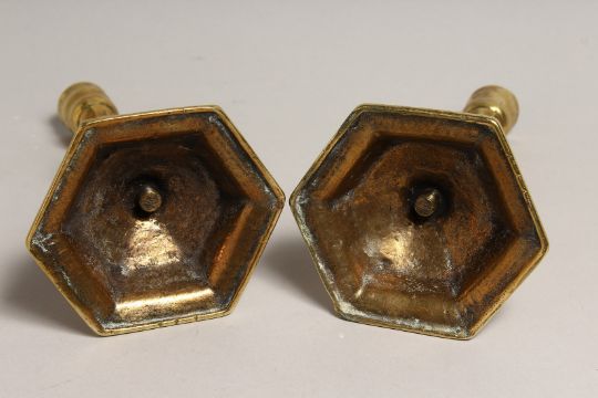 A PAIR OF 18TH CENTURY BRASS CANDLESTICKS on hexagonal bases