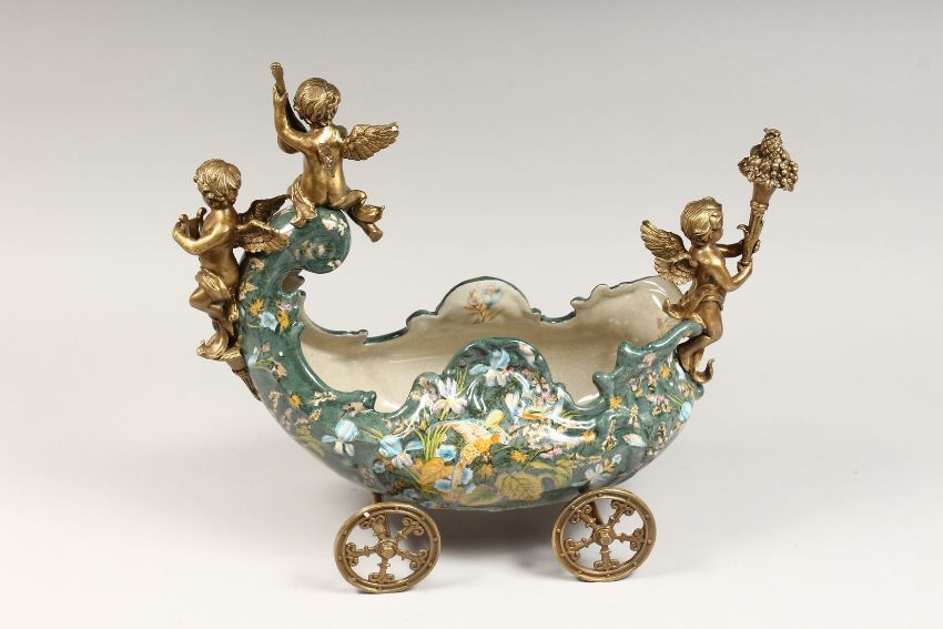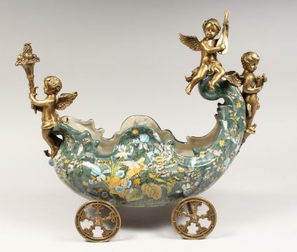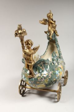 AN ORNATE PORCELAIN AND ORMOLU TABLE CENTREPIECE modelled as cherubs on a wheeled chariot.