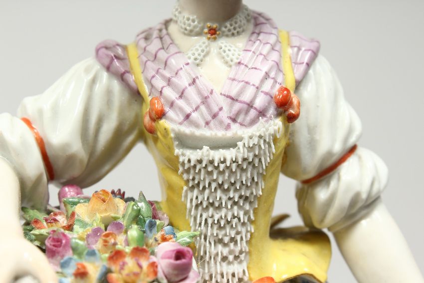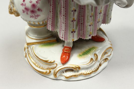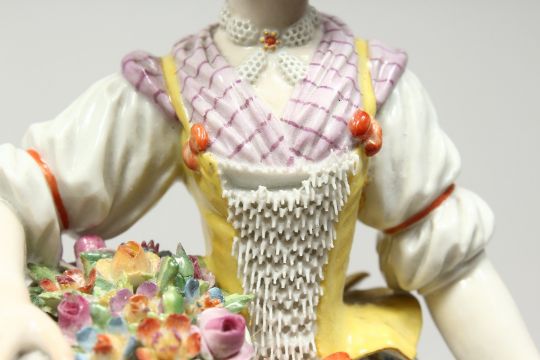 A GOOD MEISSEN PORCELAIN FIGURE OF A GARDENERESE, holding a sickle, carrying a basket of flowers, an urn by her side.