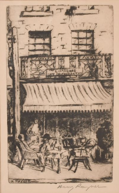 Henry Rayner (1902-1957) Australian, An etching of the Lombard caf and restaurant, signed in pencil, 7.5" x 4.5".
