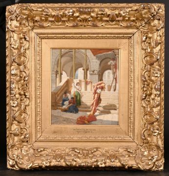Frank William Warwick Topham (1838-1924) British, 'Preparing for the Festival' with Spanish figures on the steps, oil on board, signed and inscribed on the slip, 8" x 7.25".