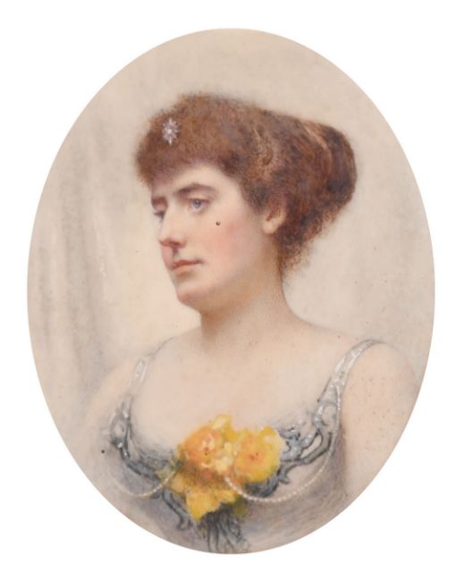 A Victorian oval portrait miniature of a Lady wearing a rose in a gilt frame, 3.5" x 2.75".