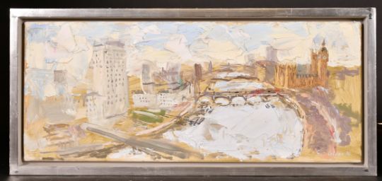 Richard Colson (b. 1955) British, Thames Panorama III, Westminster and the Thames, oil on canvas, signed and dated 1996, 10" x 24", Provenance: Theo Waddington Fine Art.