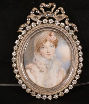 A oval portrait miniature of a Young Lady in a diamant frame, 2.25" x 1.75".