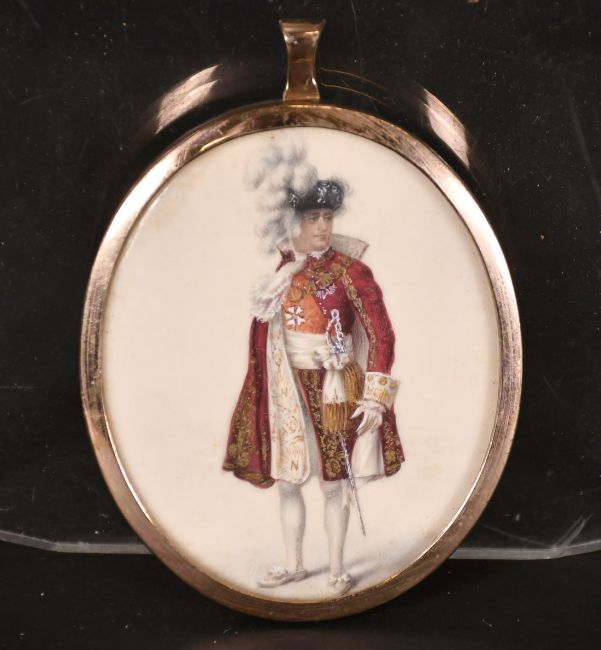 An oval portrait of a Man in ceremonial clothes in a gilt frame, 2.75" x 2.25".