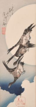 Hiroshige (1798-1858) Japanese, A Pheasant, colour woodblock and another of ducks by moonlight, with script, both "14.5 x 4.75", (2).