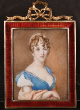 A very good miniature of a Young Lady in an enamel frame, 3.5" x 2.75".