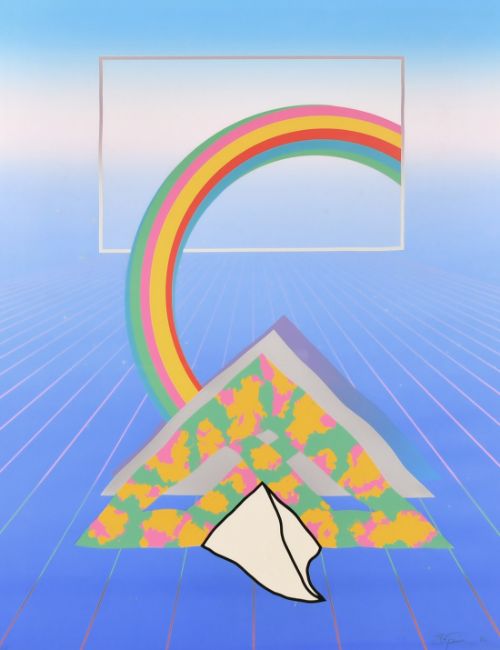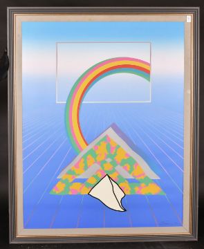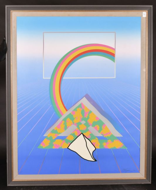 Modern British School, circa 1982, A pair of mixed technique prints of surreal scenes, each indistinctly signed in pencil and dated 82, 39.5" x 31.5" (2).