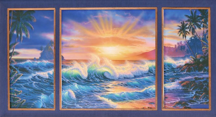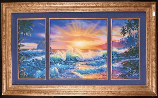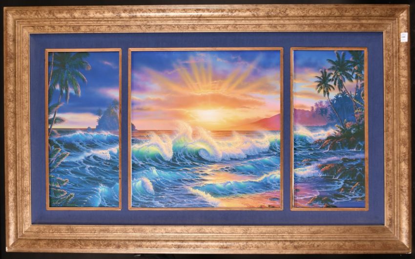 Christian Riese Lassen (b.1955) American, A triptych print, depicting a colourful ocean, with sunset and waves hitting the shore, one signed, one initialled and with 14/100, 22.75" x 11.25", 22.5" x 22.5", 22.75" x 11.25".