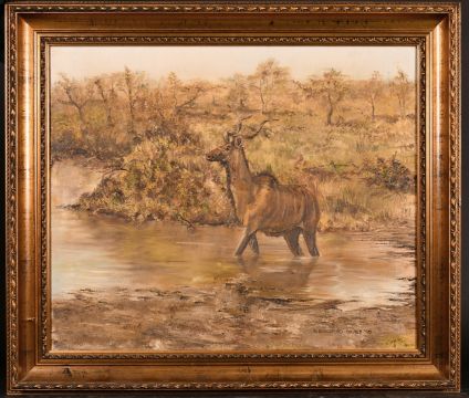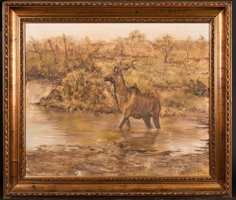 Nick Beresford-Davies, 'Kudu' in a river, oil on canvas, signed and dated '90, 19.75" x 24".