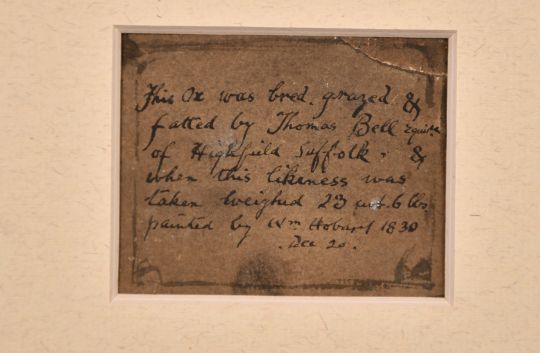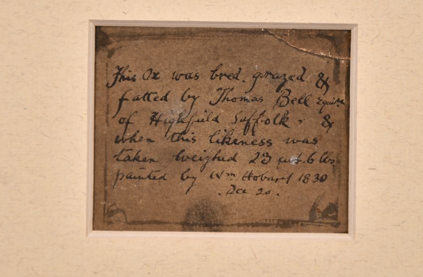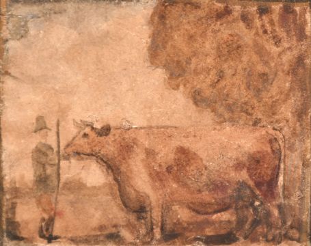 English Na ve School, Circa 1830, Thomas Bell of Highfield Suffolk and his prize Ox, watercolour, inscribed verso, 3" x 3.75, along with an unrelated 19th Century sketch of a ploughing scene, 3.75" x 5.75" (2).