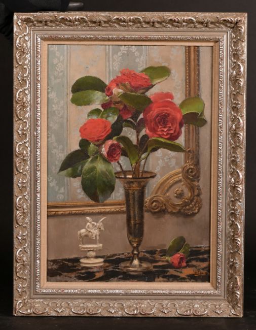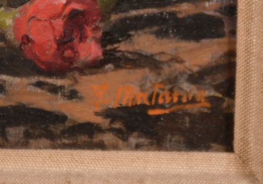Fortunio Matania (1881-1963) Italian, A still life of red flowers and an ornament on a marble table, oil on panel, signed, 13.5" x 9.5".