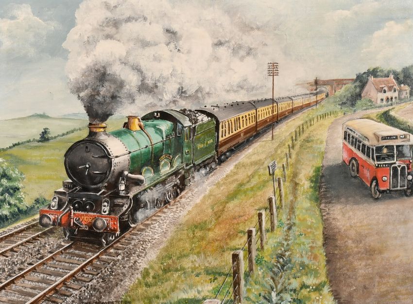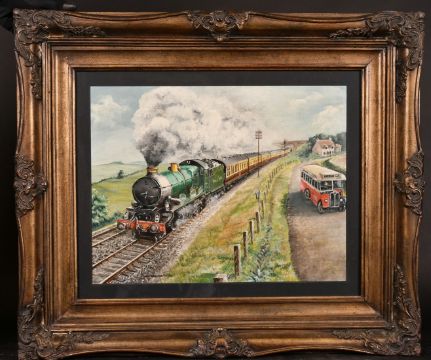 David Barnes, 'The Competition', train on the tracks and bus on the road, acrylic, signed, 13.25" x 17.25".