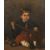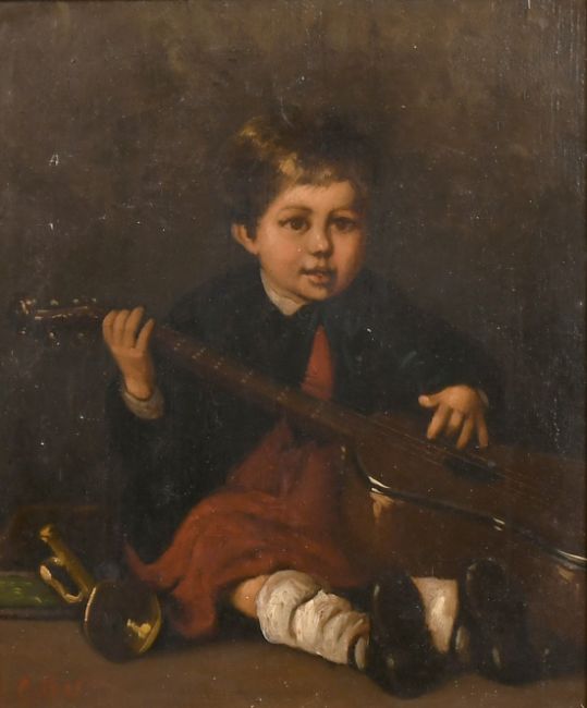 L. Gillet? 19th Century, Portrait of a young boy playing a guitar, with a trumpet by his side, oil on canvas, signed, 8" x 6.75".