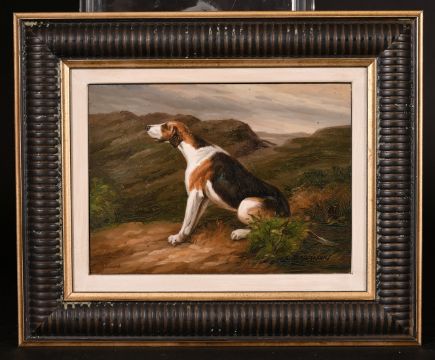 20th Century, A pointer seated in a moorland landscape, oil on panel, signed C. Harrison, 5" x 7".