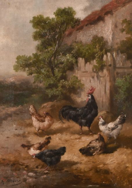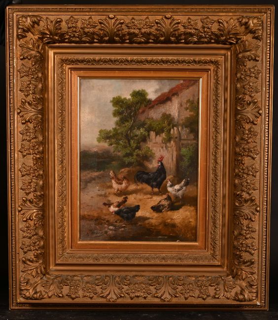 Louis-Marie Lemaire (1824-1910) French, A scene of chickens in a farmyard, oil on canvas, signed, 16" x 12", in a fine gilt composition frame.