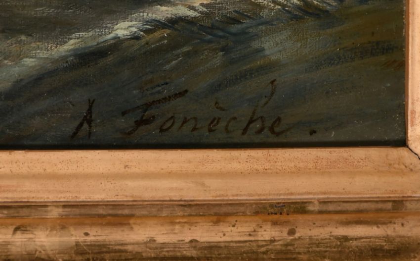 Andre Foneche (1851-1942) French, Busy shipping scenes off the Dutch coast in choppy seas, oils on canvas, both signed, 22.5" x 40.25". (2)