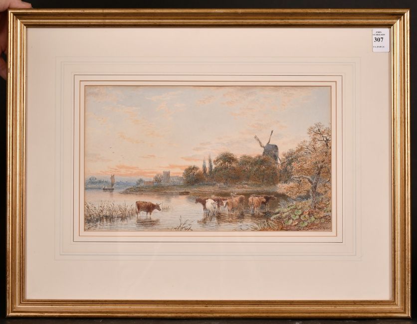 John MacPherson (Exhib.1881-8184) British, Cattle watering near a windmill at sunset, watercolour, signed, 7.5" x 12.75".
