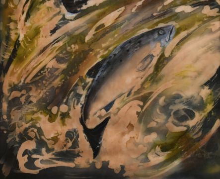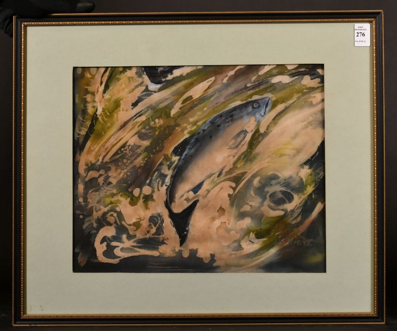 J. Villiers (20th Century) A Salmon leaping through a torrent, watercolour and bodycolor on fabric, signed, 11.25" x 14".