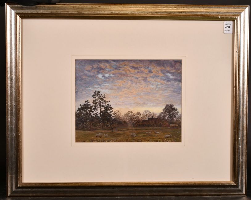 20th Century English School, Sheep grazing, figures on a track with farm stead beyond, watercolour, 8.25" x 10.75".