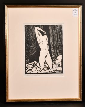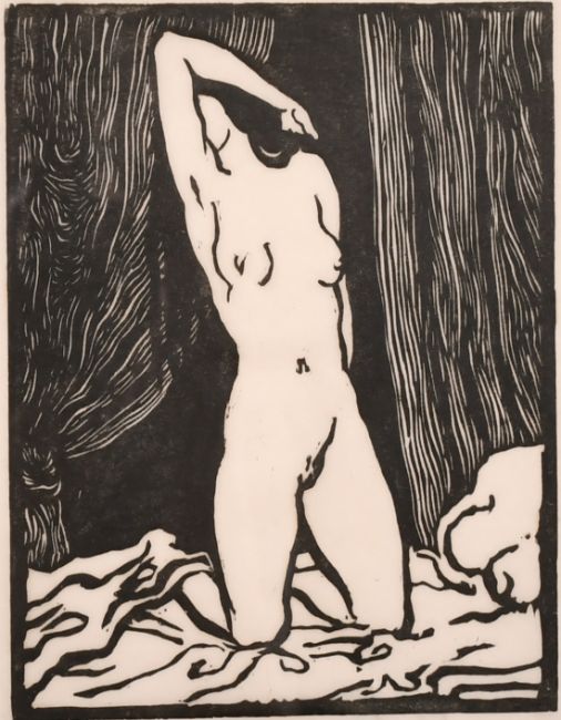 Karl Thylmann, a woodcut of a kneeling female nude, signed in pencil and inscribed 'A.TH', 8" x 6".