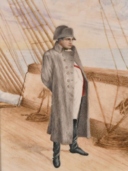 A portrait of Napoleon standing on board ship in a gilt frame, 3.5" x 2.75".