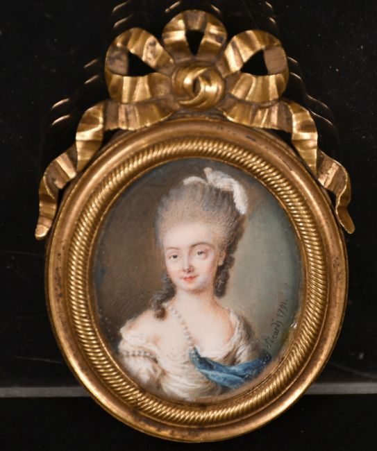 18th/19th Century French School, A miniature portrait of a noblewoman, signed Sicardi? and dated 1791, 1.75" x 1.5", in a fine gilt metal frame.