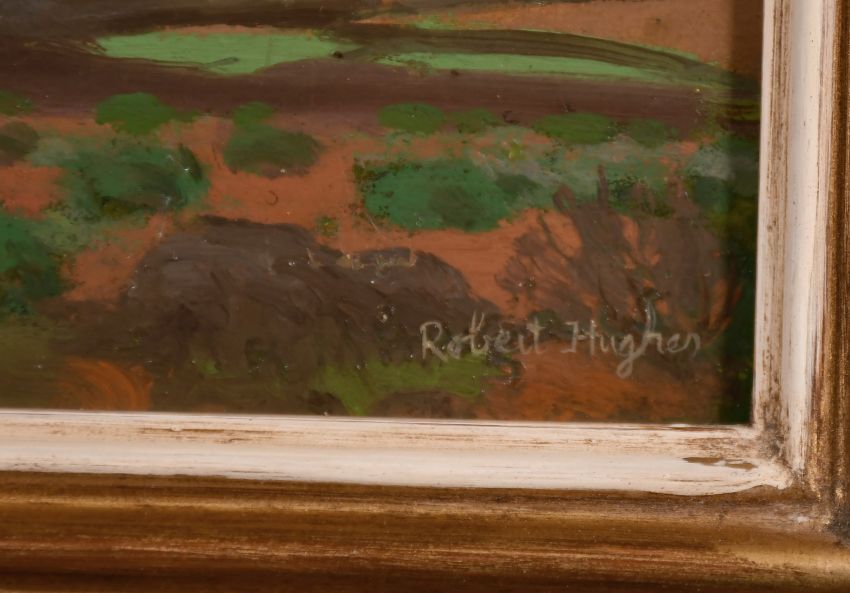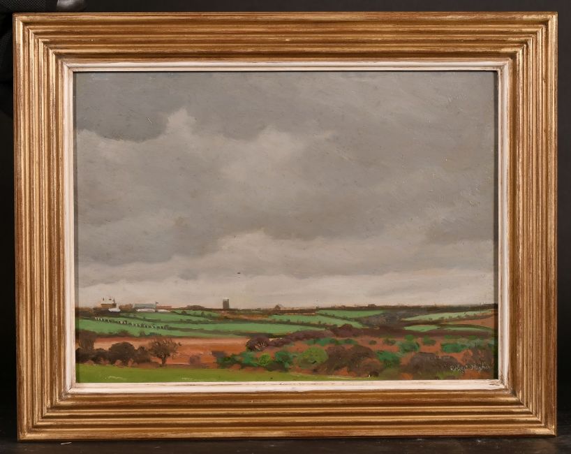 Robert Morson Hughes (1873-1953) British, Patchwork fields with building in the distance, oil on board, signed, 10" x 14".