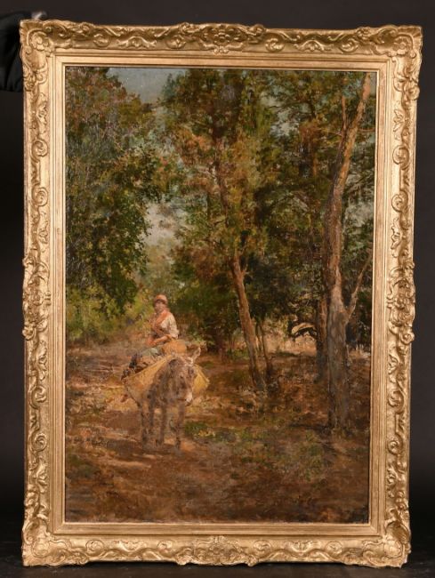Eduardo Matania (1847-1929) Italian, A young woman on a donkey on a sunlit woodland path, oil on canvas, signed, 26" x 18".