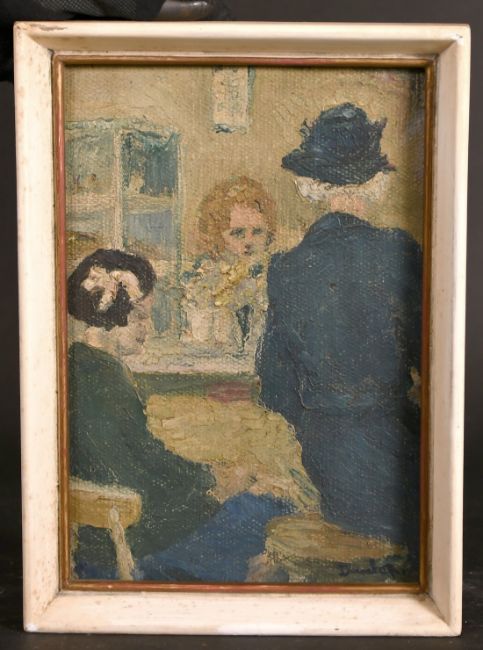 Ronald Ossory Dunlop (1894 - 1973) British, 'Youth and age in the public house', oil on board, signed, 10" x 7".