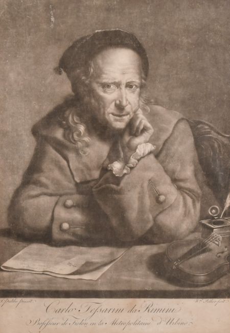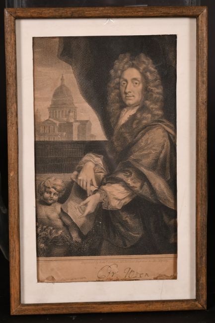 Pether after Palthe, 18th Century mezzotint of 'The violinist Carlo Tessarini', 13.75" x 9.75" and two further portrait prints of a military officer, 13.75" x 7.25" and Sir Christopher Wren 8" x 4.5", (3).