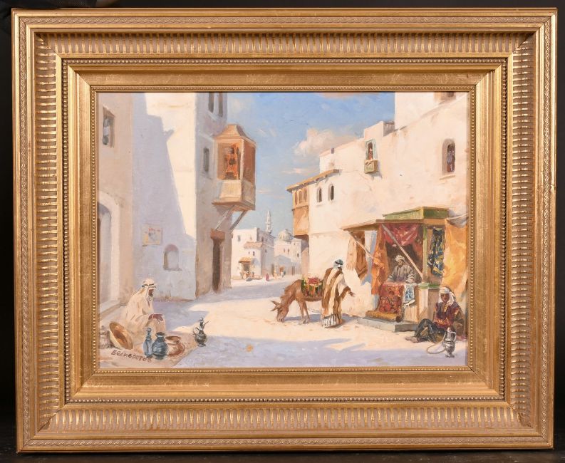 Russian School (20th Century) Arabian street scene with figures, oil on board, signed and inscribed verso, 15" x 15.75", (30 x 40 cm).