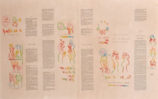 Arthur Rimbaud (1854-1891) French, A pair of prints of poetry in French embellished with paintings or pochoir in the Manner of Delaunay, on Arches paper with mixed media, one dated Avril 1873, 26.25" x 41.25", (2).