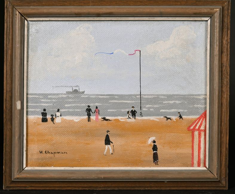 Margaret Chapman (1940-2000) British, Figures and dogs on a French beach with a paddle steamer ship beyond, oil on board, signed, 9" x 11".