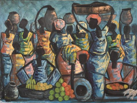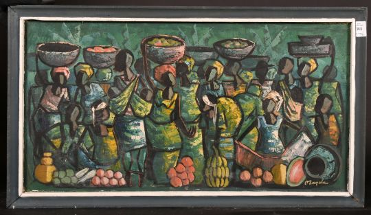 Circle of Maurice van Essche, Women at a market, oils on canvas, both signed Magda, 14" x 26" and 15.5" x 21". (2).