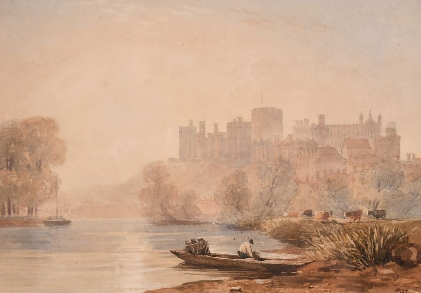 David Cox Junior (1809-1885) British, Windsor Castle from the Thames with cattle grazing nearby, watercolour, signed and dated 1833, 7" x 10.25".