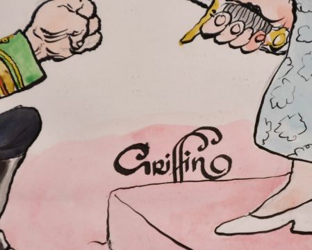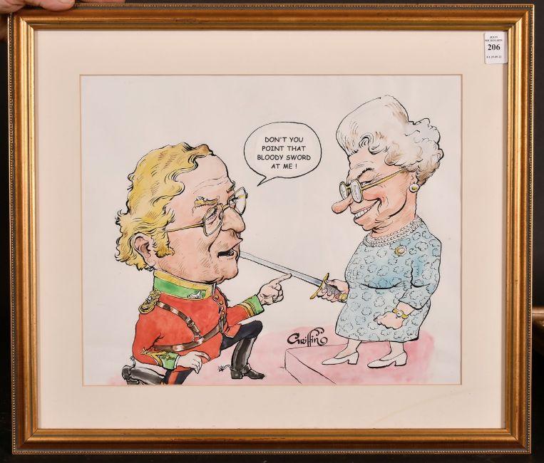 Charles Griffin (b.1946) An original cartoon, a scene of Michael Caine being knighted by the Queen, 12"x 15".