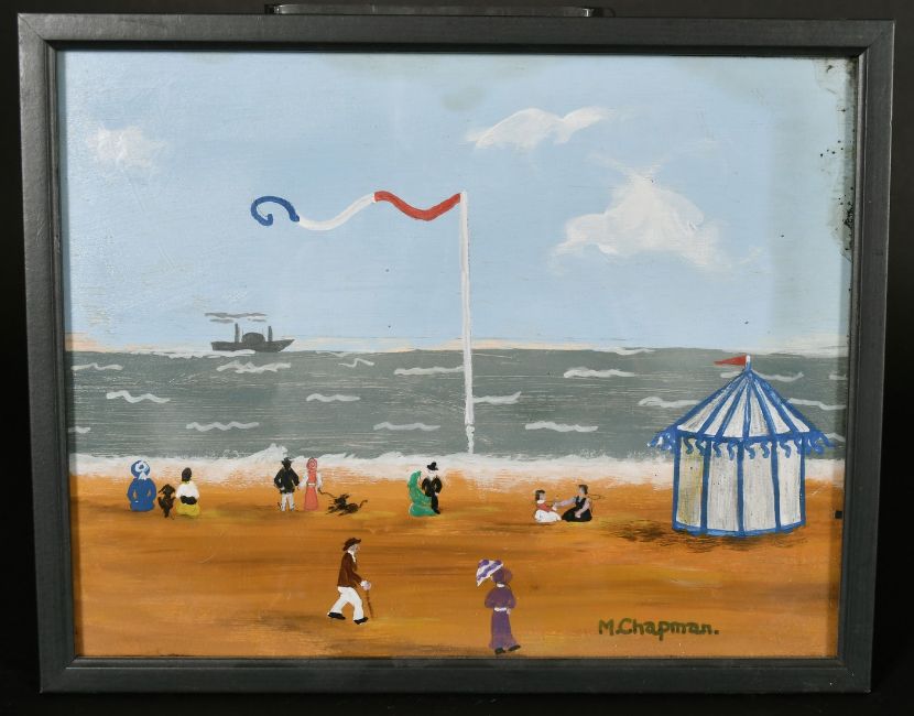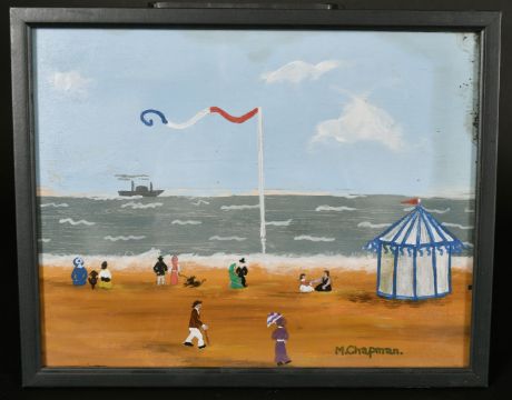 Margaret Chapman (1940-2000) British, Figures on a French beach and a paddle steamer ship beyond, oil on board, signed, 11"x 14".